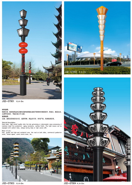 景觀燈分類:城市標志性景觀燈、仿古景觀燈、鏤空現代景觀燈、不銹鋼景觀燈、藝術造型景觀燈等
